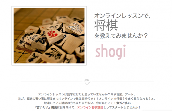 最近は語学オンラインレッスン以外にも、ピアノやクラリネット等の音楽レッスンや、イラスト、デザイン、書道等のレッスンを提供する芸術家の登録も増えております。その流れを汲み、おけいこ・習い事系のレッスンを充実させるため、この度オンライン「将棋講師」募集ページをリリース致しました。