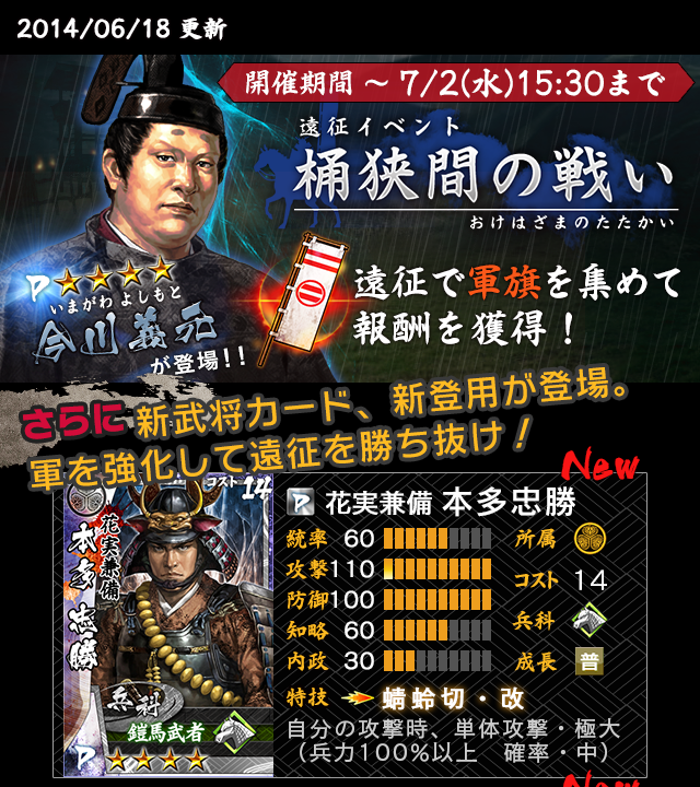 襟川陽一)と共同で開発した、携帯合戦シミュレーションゲーム『モバノブ』(http://www.moba-nobu.jp)において、18日(水)15時より、遠征イベント「桶狭間の戦い」を開始したことをお知らせいたします。