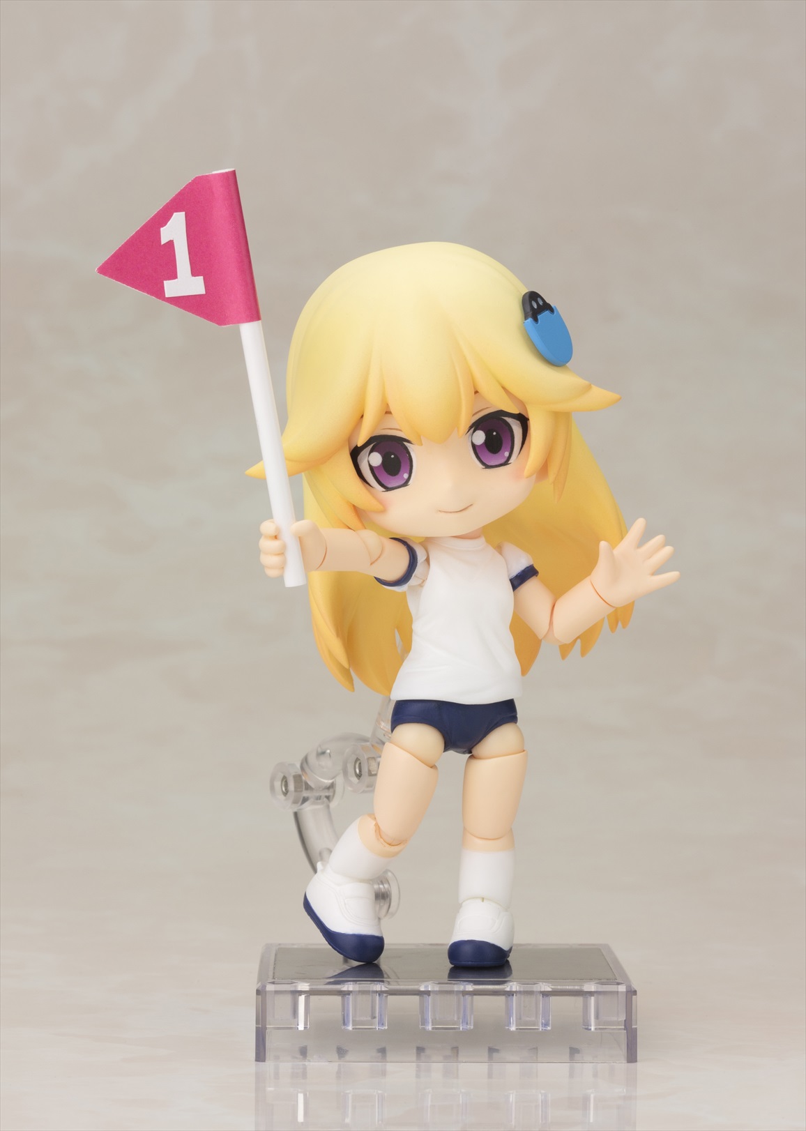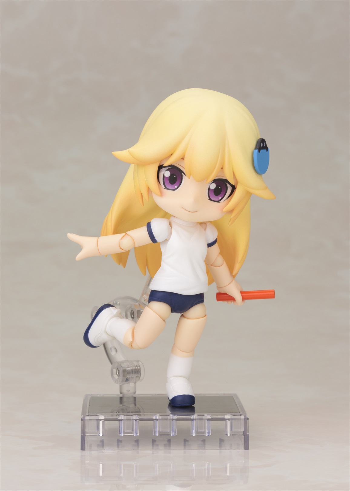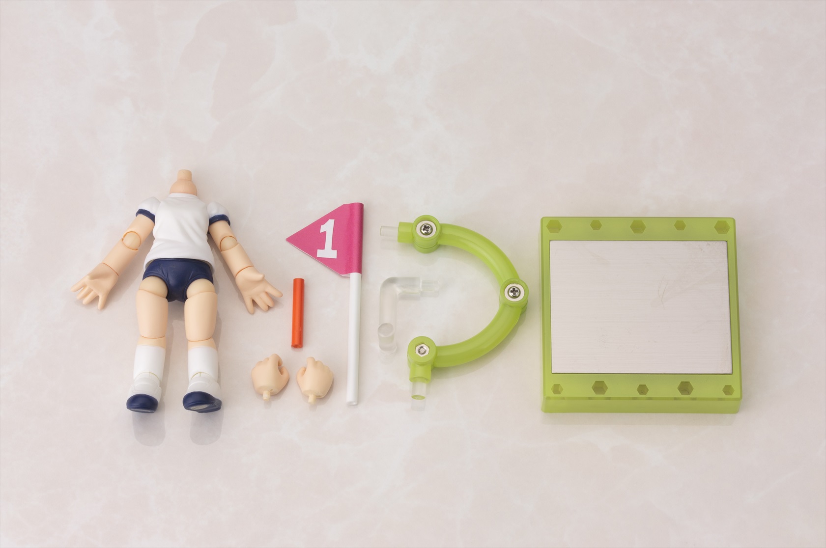 第2弾はキャラクター達を着せかえて楽しい「半袖体操服ボディ」。腰の可動部に関節が入っており、お座りなどポーズの幅が広がります。第1弾の「スクール水着ボディ」同様、足首に新関節パーツを採用し可動範囲を向上させています。付属の「フラッグ」「バトン」「フレッシュグリーンの台座」で遊んだり、着せかえ用の素体として小さなサイズのドール服で着飾ることもできます。