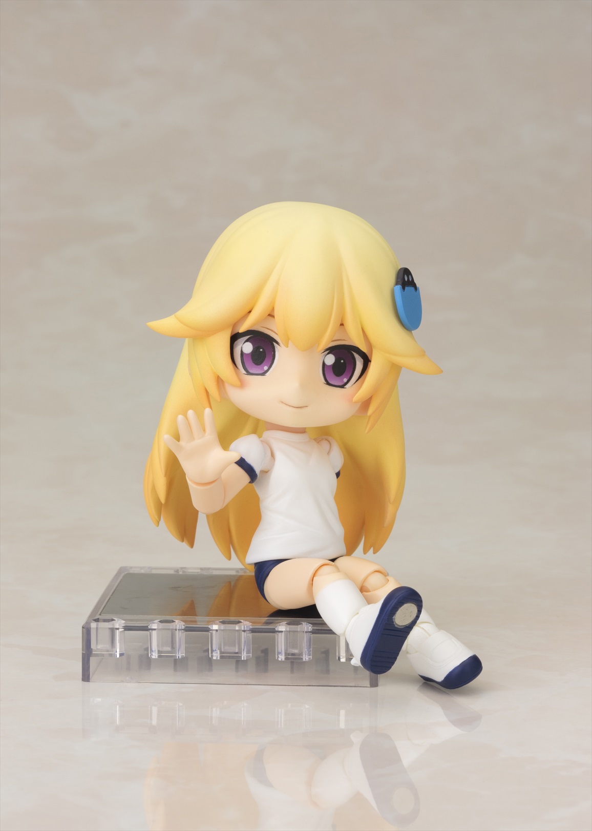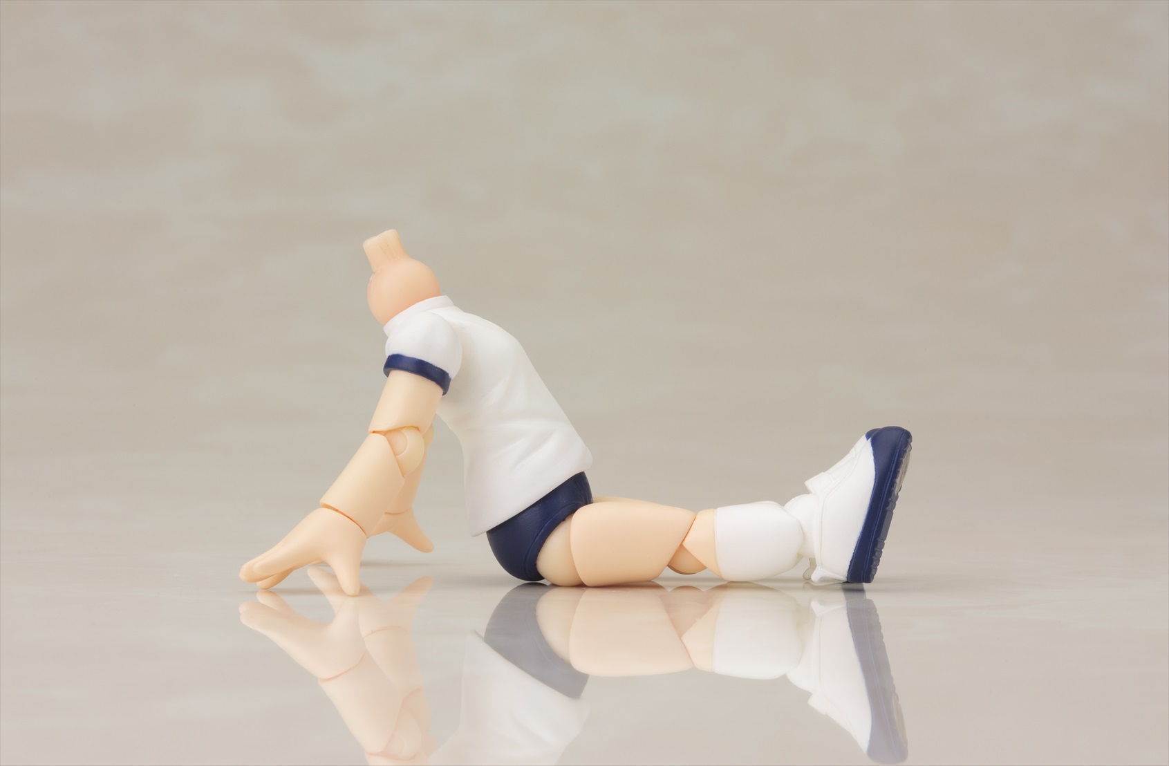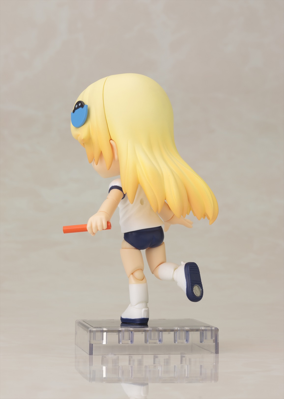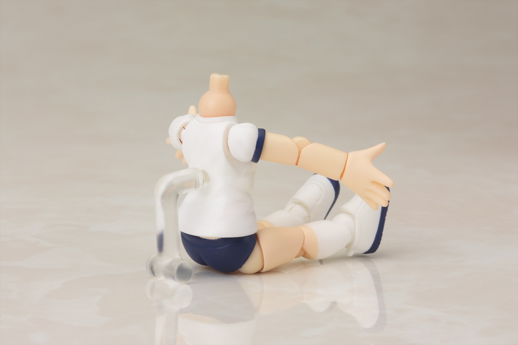 第2弾はキャラクター達を着せかえて楽しい「半袖体操服ボディ」。腰の可動部に関節が入っており、お座りなどポーズの幅が広がります。第1弾の「スクール水着ボディ」同様、足首に新関節パーツを採用し可動範囲を向上させています。付属の「フラッグ」「バトン」「フレッシュグリーンの台座」で遊んだり、着せかえ用の素体として小さなサイズのドール服で着飾ることもできます。