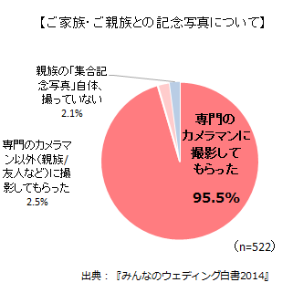 当日の家族・親族との記念撮影については、「専門のカメラマンに撮影してもらった(95.5%)」が多く、記念写真をより良く撮影してもらいたい意向が伺えます。そのシチュエーションは「全員で(ひな段などに)整列して、撮影(87.9%)」、「各ゲストテーブルに、花嫁・花婿がまわった際の記念撮影(61.0%)」から、「整列ではなく自由なポーズ(34.7%)」もあがり、記念となる1枚を楽しむ姿が伺えます。