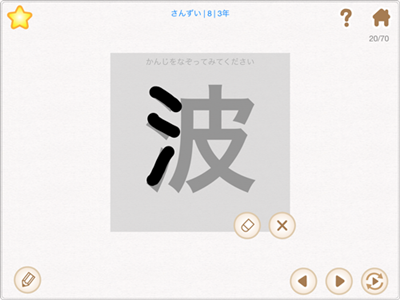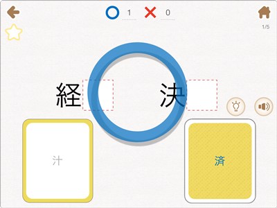 学んだ漢字を「漢字を見て音をあてる」 「漢字を見て意味をあてる」 「ブランクに入る漢字をあてる」の3種類のテストで学ぶことができます。またテスト終了後には正答/誤答数、正答率などが表示され、成績が一目でわかります。