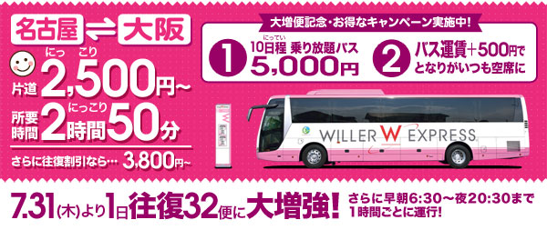 ・携帯、スマートフォンサイト:http://travel.willer.co.jp/st/3/ja/mb/bus/campaign/osaka-nagoya/