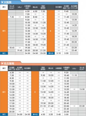 運行スケジュールは、名古屋⇔大阪梅田間を片道2時間50分で運行する直通便と、阪急電鉄京都本線「西山天王山駅」直結の「高速長岡京バス停」や「ユニバーサル・スタジオ・ジャパン(R)」、「なんば」での乗下車が可能な経由便があり、目的地や観光地に便利に直行でき、またシームレスな利便性の高い乗換が可能です。