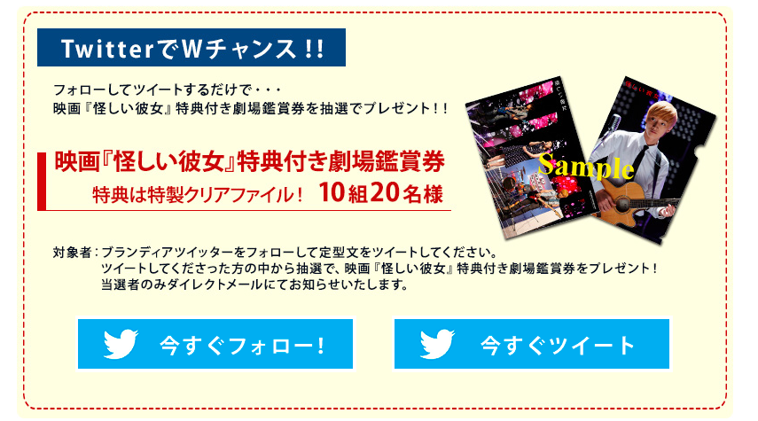 さらに、抽選に外れた方を対象に「Wチャンス」として、ブランディアツイッターをフォローして定型文をツイートして下さった方の中から抽選で映画『怪しい彼女』特典付き劇場鑑賞券をプレゼントいたします。