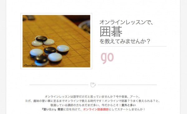 最近は語学オンラインレッスン以外にも、ピアノやクラリネット等の音楽レッスンや、イラスト、デザイン、書道等のレッスンを提供する芸術家の登録も増えております。その流れを汲み、おけいこ・習い事系のレッスンを充実させるため、この度オンライン「囲碁講師」募集ページをリリース致しました。
