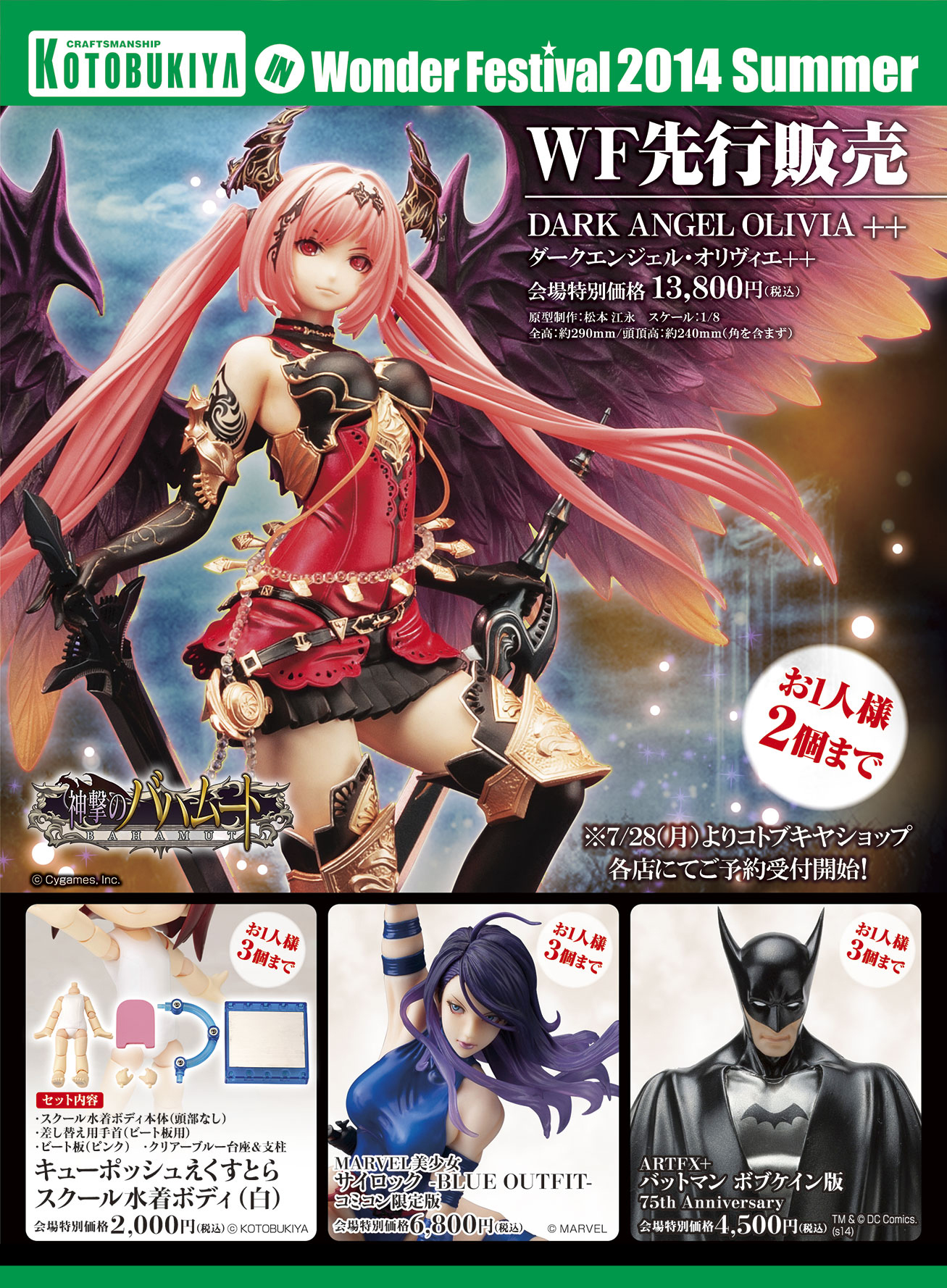 会場先行販売品は、人気商品「ダークエンジェル・オリヴィエ」の一部造形変更+色替えの「ダークエンジェル・オリヴィエ++(神撃のバハムート)/13,800円」、可動フィギュア「キューポッシュ」の着せ替えパーツ「キューポッシュえくすとら スクール水着ボディ(白)/2,000円」、同時期にアメリカで開催されるサンディエゴコミコンにて発売予定の完全新規造型「ARTFX+ バットマン ボブケイン版75thAnniversary/4,500円」、一部リペイントされた「MARVEL美少女 サイロック-BLUE OUTFIT- コミコン限定版/6,800円)」の4種です。他、ダンボーのお腹に“コトブキヤロゴ”が描かれ、目が光っている「ダンボーストラップ コトブキヤver./800円」や発売中の「キューポッシュ」シリーズ各種も販売します。