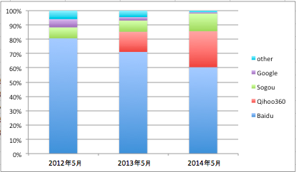 中国における検索エンジンシェアは、百度が不動のシェア1位であるものの、2位以下が大きく変化しています。新興検索エンジンQihoo360がシェアを25.18%まで伸ばし(2014年5月時点)、以前3位であったGoogleはシェアを1%以下まで落としています。