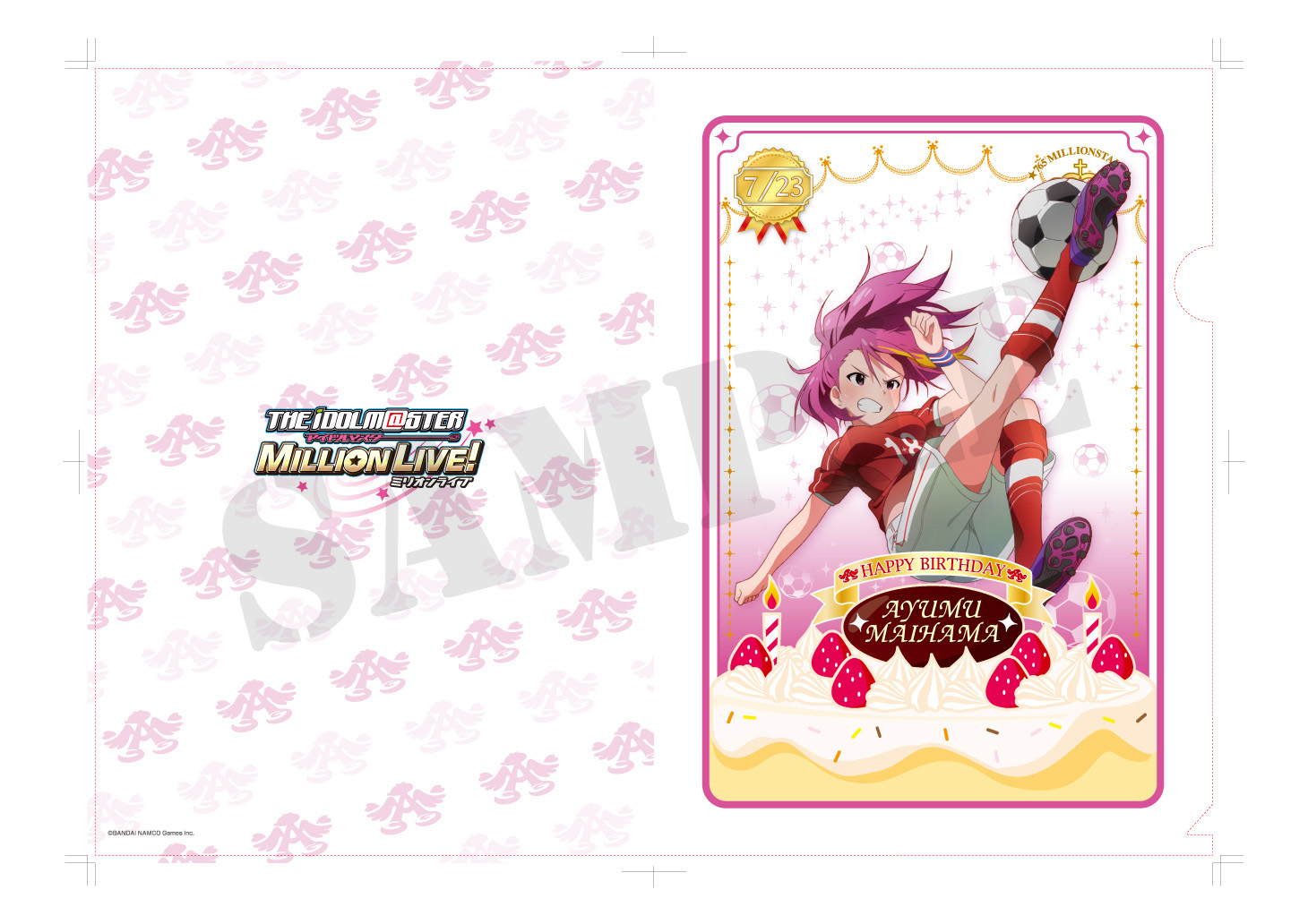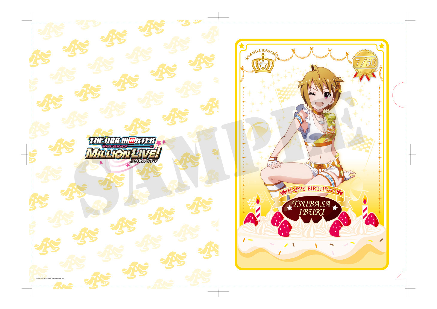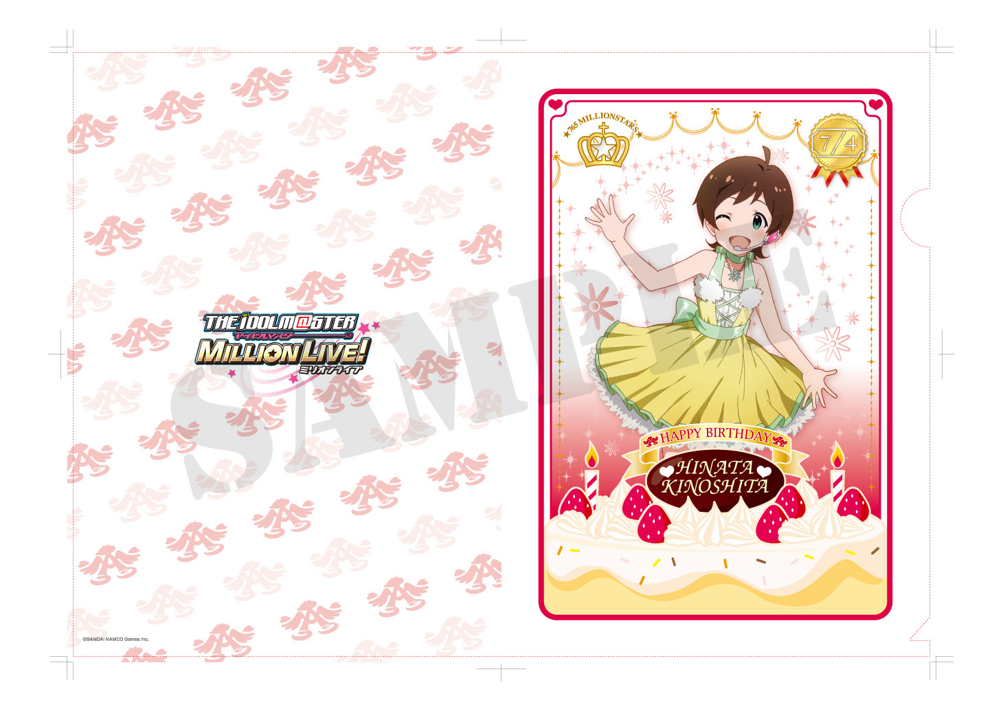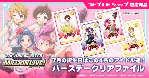 アイドル達のイラストはTVアニメ・劇場版アニメ制作のA-1 Picturesがゲームのために描き下ろしたものを使用。フレームにそれぞれのキャラクターのイメージカラーとバースデーケーキを加え、誕生日を迎えるアイドル達を豪華に、そして可愛くアレンジしたデザインのクリアファイルとなっています。第1弾として、7月が誕生日である「木下ひなた」「三浦あずさ」「舞浜歩」「伊吹翼」のクリアファイルを2014年7月1日に発売予定です。