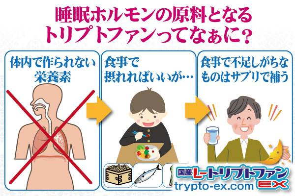 睡眠ホルモン「メラトニン」の原料である「トリプトファン」は、「必須アミノ酸」※ であり、体内で作ることができません。