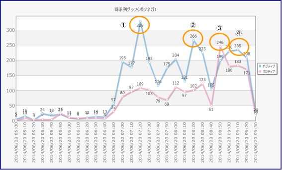 図1 2014/6/20 5:00~9:30ツイート件数推移(10分ごと)