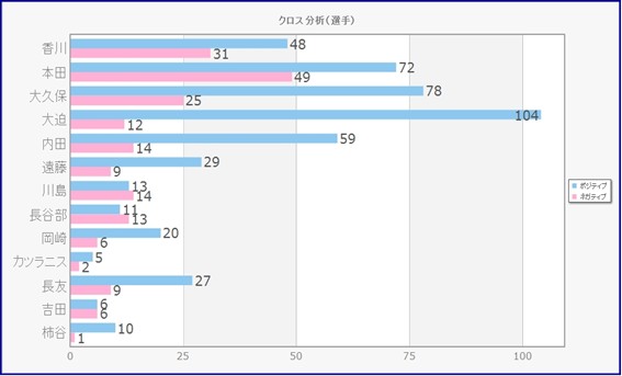 ●香川への言及が最も多いが、ポジティブな表現では大迫がトップ