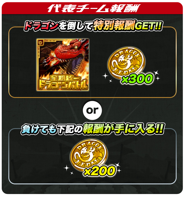 をプレゼントいたします!また、惜しくも負けてしまった場合も「ドラゴンメダル」200枚をプレゼントいたします!