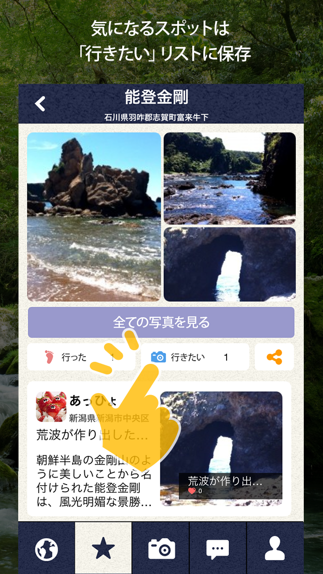 気になるスポットに「行きたい」ボタンを押すだけで、あなただけの行きたい場所リストが作成できます。