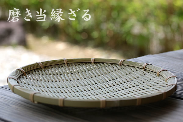 竹の表皮を薄く削りとった「磨き」と呼ばれる加工。磨き当縁ざるは、縁部分に編み込んでいる竹ヒゴに磨き加工をほどこしております。思わず目を惹かれてしまう落ち着いた輝きと独特の深み。表面の竹ひごは厚みを持たせ、一本一本角を取り除いてカマボコ状に仕上げておりますので、水切れが非常に良いのが特徴です。そのため、野菜の水切りや麺類の湯切りなど色々な場面で活躍してくれます。