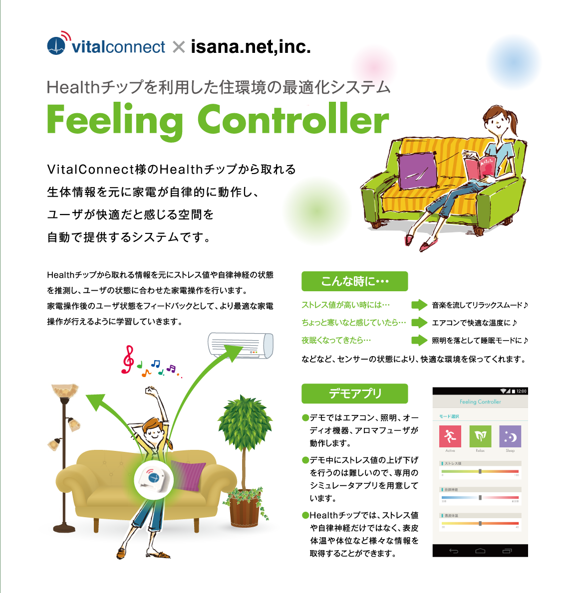 本 アプリケーションは、バイタルコネクト(本社:米国カリフォルニア州キャンベル市、代表取締役:ナーシ・ナザリ、以下バイタルコネクト)が開発している ウェアラブルセンサーから取得できる生体情報を元にユーザのストレスや自律神経の状態を推測し、ユーザの状態に合わせた家電の操作を行います。