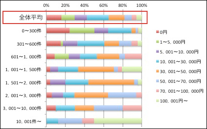 その結果、全体ではコストをかけていないショップが2割強ありますが、月間受注件数が300件を超えると、1万円以上支出するショップが半数となり(50%)、同様に月間受注件数が1,000件を超えると、実に70.6%が1万円以上支出していることが分かります。