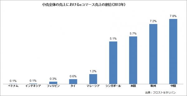 Eコマース市場の成長が著しい中国を例に挙げると、2013年の小売全体の売上におけるeコマース売上は全体の7.8%を占めている。これは、米国や欧州、日本よりも高い割合であり、この中国のケースは東南アジアにおけるeコマース市場の急速な成長の可能性を示唆するものとなり得る。