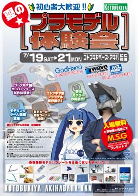 ホビーメーカー株式会社壽屋(本社:東京都立川市曙町/ 代表:清水一行)は、直営店「コトブキヤ 秋葉原館(東京都千代田区外神田1-8-8)」にて、7月19日(土)~21日(月・祝)の3日間、ウェーブ、ミスターホビー、ゴッドハンドの工具製品の試用体験ができるイベント「プラモデル体験会」を開催します。