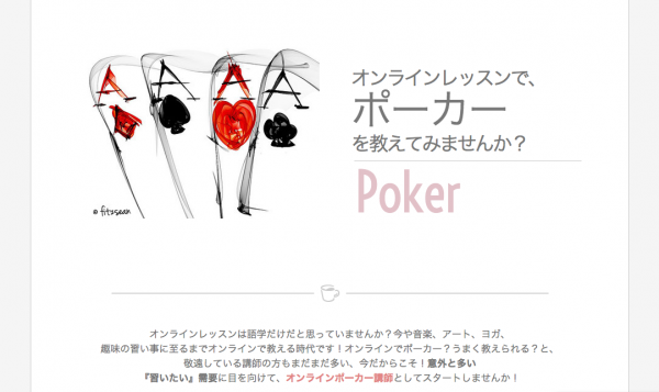 最近は語学オンラインレッスン以外にも、ピアノやクラリネット等の音楽レッスンや、イラスト、デザイン、書道等のレッスンを提供する芸術家の登録も増えております。その流れを汲み、おけいこ・習い事系のレッスンを充実させるため、この度オンライン「ポーカー講師」募集ページをリリース致しました。