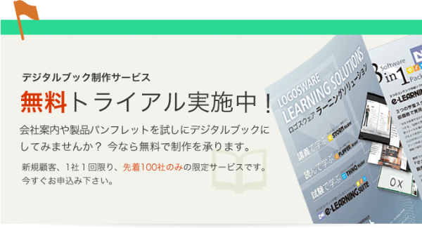 ロゴスウェア株式会社(本社:茨城県つくば市、代表取締役社長:石神 優)は、同社が提供するデジタルブック制作サービスの無料トライアルを実施すると発表しました。 デジタルブック制作費と1年間のウェブ配信サービスが無料で提供されます。対象は、当社の同サービスを利用したことのない新規顧客で1社1回のみ、先着100社に達成した時点で終了します。