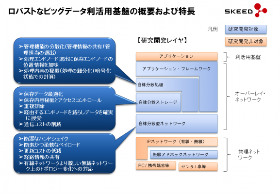 Skeedはこの課題克服に、創業以来取り組んできたP2P自律分散ネットワーク技術がキー・テクノロジーになると捉え、昨年5月に慶應大学と共同で総務省の平成25年度研究開発プロジェクト「ロバストなビッグデータ利活用基盤技術の研究開発」に提案・採択されました。その後の研究・開発により大規模かつ広域で、常時あるいは局所的に予測困難な変動を生み出すデータトラフィックを安定的に伝送し、かつ耐障害性に優れたネットワーク基盤システムの開発に成功しています。