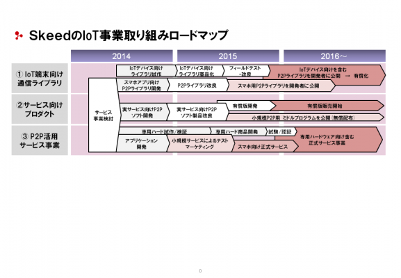 この基盤技術をベースに、さらに要素技術の開発および事業化を企画・推進するべく本年6月1日付でSkeed内にIoT事業開発室を設置、今秋にはIoT市場への展開を本格化させる予定です。