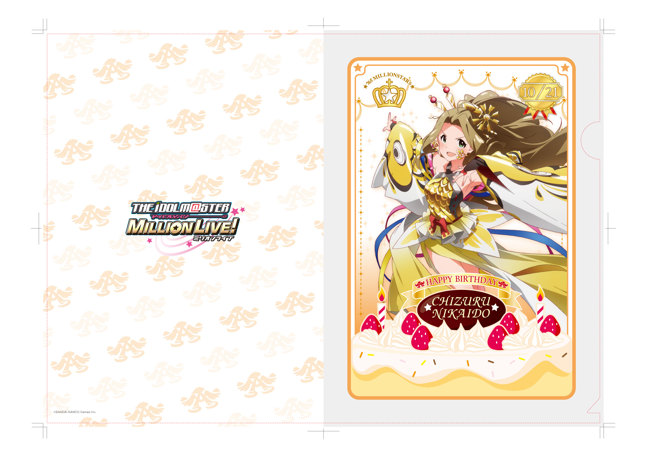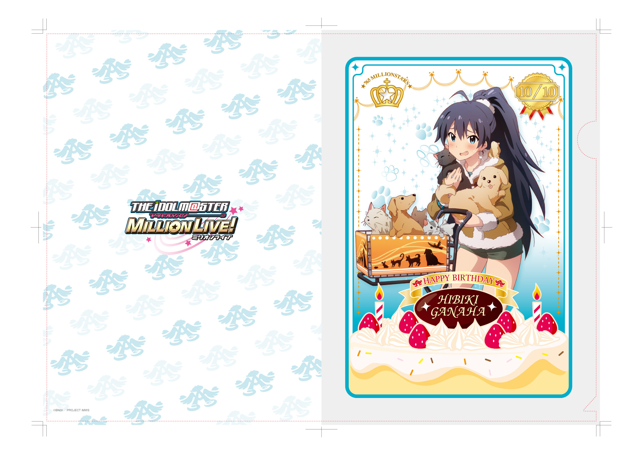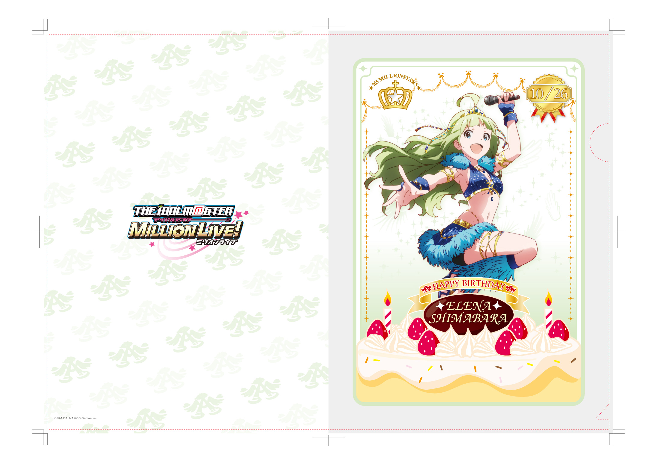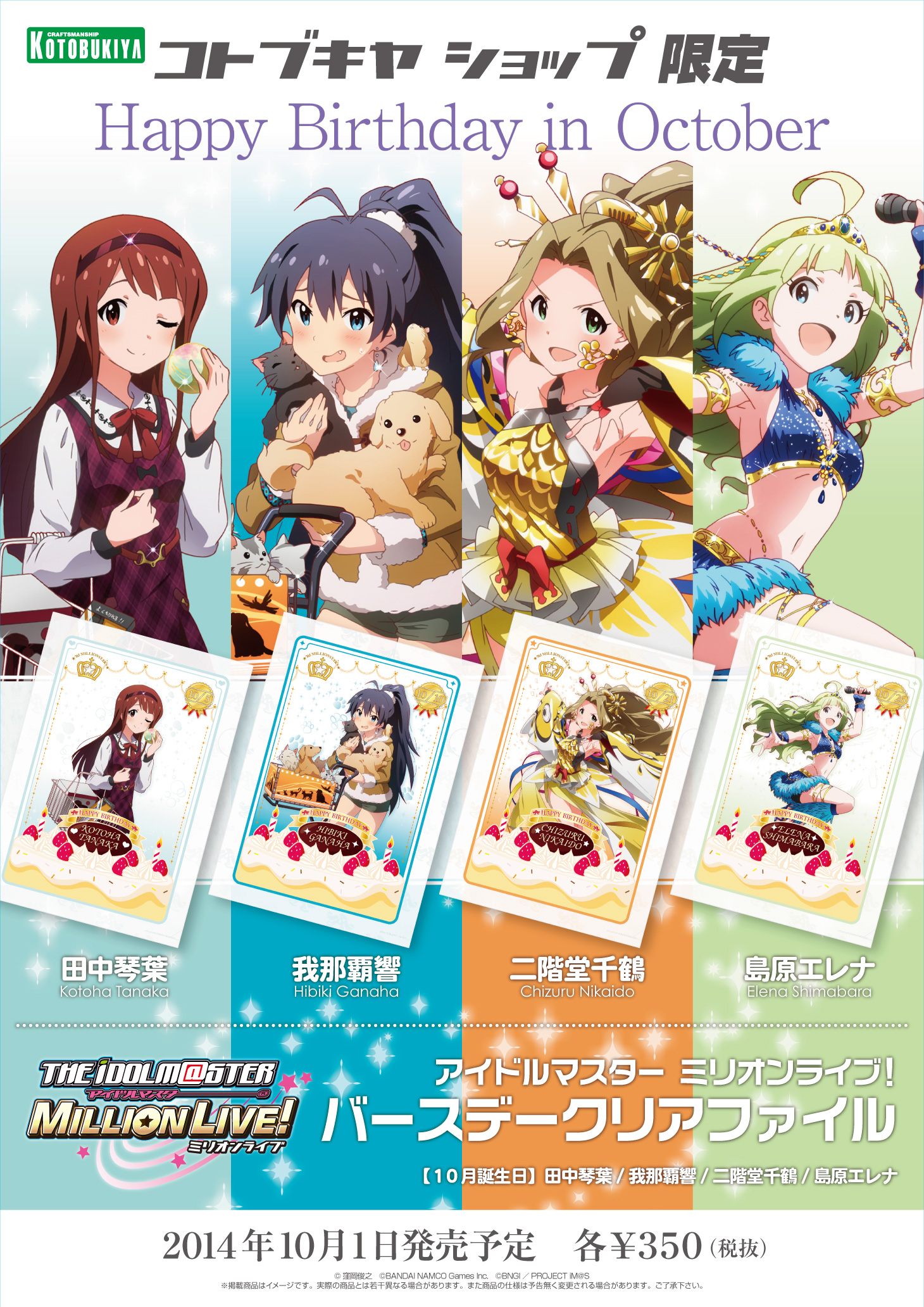 アイドル達のイラストはTVアニメ「THE IDOLM@STER」・劇場版アニメ「THE IDOLM@STER 輝きの向こう側へ!」制作のA-1 Picturesがゲームのために描き下ろしたものを使用。フレームにそれぞれのキャラクターのイメージカラーとバースデーケーキを加え、誕生日を迎えるアイドル達を豪華に、そして可愛くアレンジしたデザインのクリアファイルとなっています。第4弾として、10月が誕生日である「田中琴葉」「我那覇響」「二階堂千鶴」「島原エレナ」のクリアファイルを2014年10月1日に発売予定です。