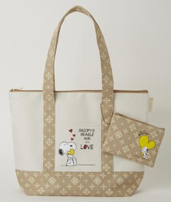 小物の出し入れに便利な外ポケットに、スヌーピーとウッドストックのハグ名場面をプリントしました。