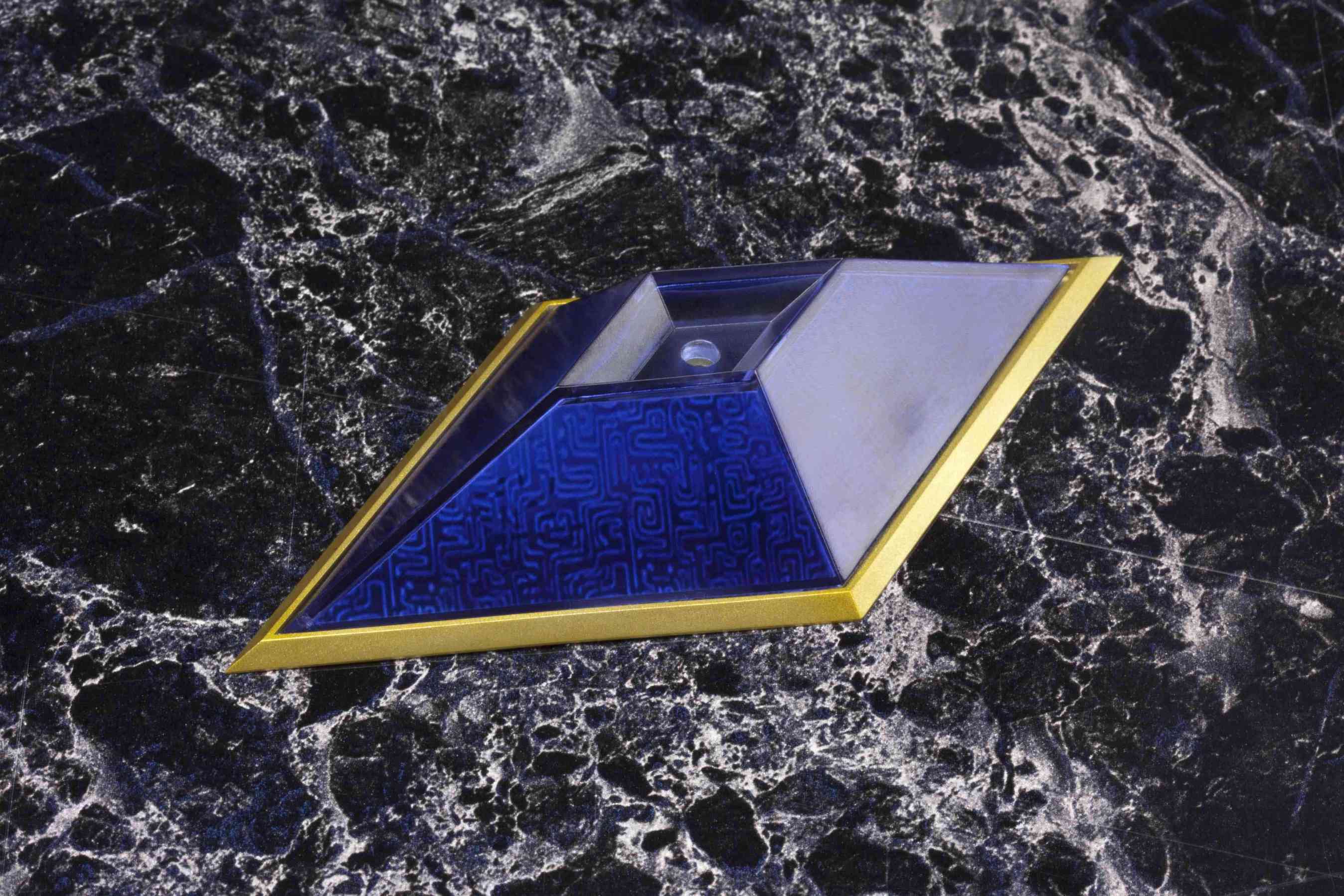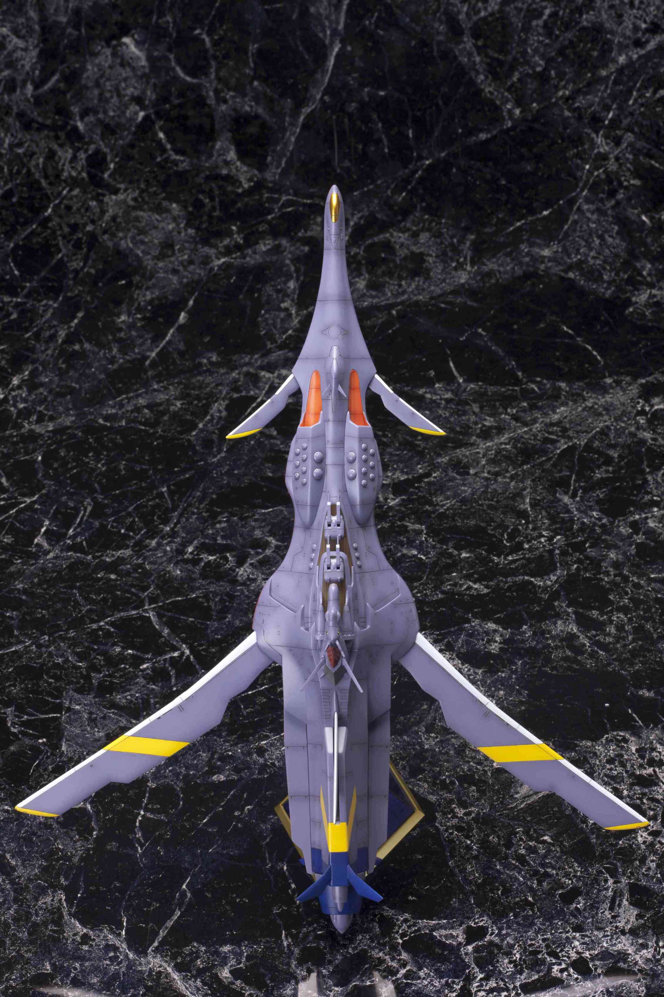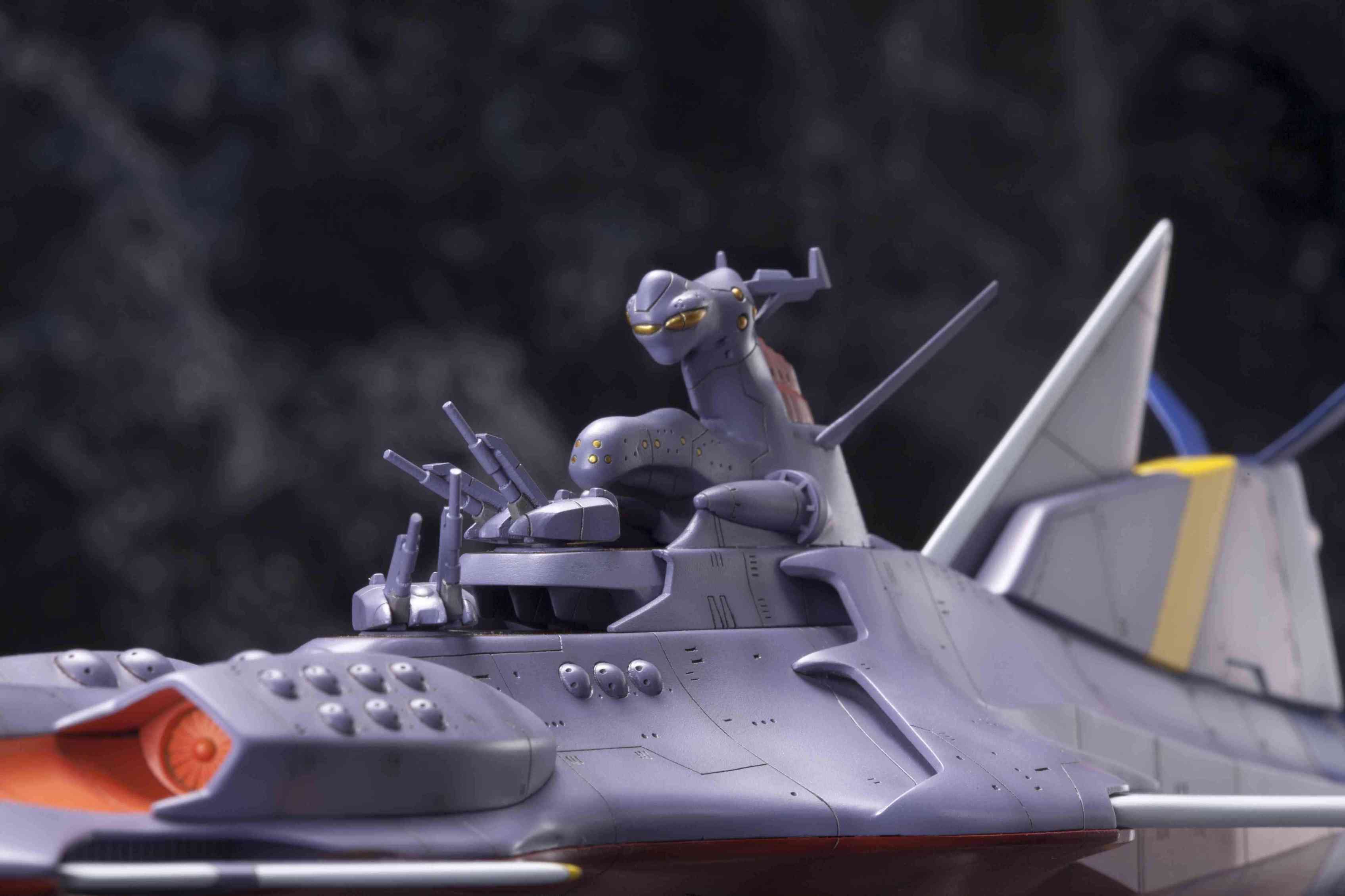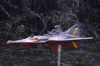 90年代に人気を博したテレビアニメ『ふしぎの海のナディア』の劇中に登場した幻の発掘戦艦「Ν-ノーチラス号」。作中で印象的なアイコンであるブルーウォーターを台座としてあしらい、主翼、副翼、垂直尾翼は、後部ブースターを回転させる事で連動して展開/収納する事ができます。ベースはクリアー成型となっており、内部に印刷済みの文様シートを入れてブルーウォーターを再現できます。収納状態の砲塔が2基付属し、ギミック後部ブースター部を回転させると連動して各翼が展開/収納します。また、主砲の砲身は可動式で、収納状態の砲塔を差替えて再現できます。艦橋窓部と専用ベースの金色部分は塗装済みとなっています。全長約30cmの迫力の戦艦を是非お手元でお楽しみください。