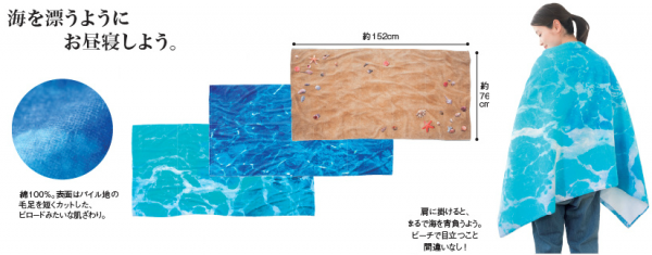深海魚ポーチの背景の海辺の風景はこのタオルケット! リアルプリントでお部屋が浜辺に変身!