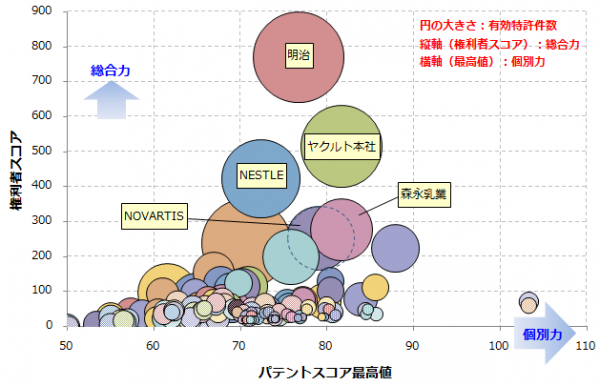 そこで、本調査では乳酸菌に関連する技術全般に着目し、各個別特許の注目度を得点化する「パテントスコア」をベースとして、特許の質と量から総合的に見た評価を行いました。