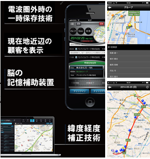 「フィールドで活躍する全てのモバイルワーカーへ~街を企業の情報ストレージに~」をコンセプトに、スマートデバイスから現在地近辺の顧客や営業情報がプッシュで表示される機能を通じて外出先で効率的な営業活動を実現する、特許出願中技術を実装した次世代のCRM/SFA(営業支援アプリケーション)です。