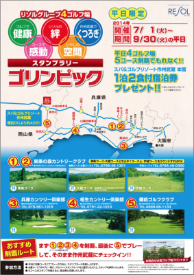 今回の関西5コース制覇スタンプラリー『ゴリンピック』は、全国に運営するRESOLグループゴルフ場のうち、中国自動車道と山陽自動車道沿いにある東条の森カントリークラブ3コース(東条・大蔵・宇城コース)と兵庫カンツリー倶楽部、相生カントリー倶楽部、備前ゴルフクラブの計4ゴルフ場6コースのうち5コース制覇を対象にした企画で、期間中、平日に対象コースのどこかでプレーしていただくとスタンプカードがもらえ、他コースでのプレー時にフロントへスタンプカードを提示するとスタンプを押印。対象6コースのうち東条の森CCの2コース+他の3コースをラウンド制覇するともれなく「スパ&ゴルフリゾート作州武蔵」(作州武蔵CC)での“1泊2食付宿泊券”をプレゼントするというものです。お問合せは各ゴルフ場まで。
