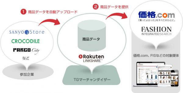 広告主(ECサイト)は、TGマーチャンダイザーを活用することで、毎日更新された商品データを価格.comやFashion Integrated Search(ファッション インテグレーテッド サーチ、以下「FIS」)」※2に掲載することが可能になります。現在、TGマーチャンダイザーには、SANYO iStoreやCROCODILE Online Shop、PARCO-CITYなどの広告主(ECサイト)が参加しており、対象媒体へ約40万点の商品データの配信が可能です。