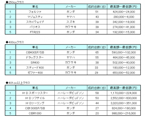 情報流通支援サービスの株式会社オークネット(本社:東京都港区/社長:藤崎清孝)は、2014年6月度のオークネットバイクオークションにおける成約台数を集計し、排気量別ランキングベスト5をまとめました。