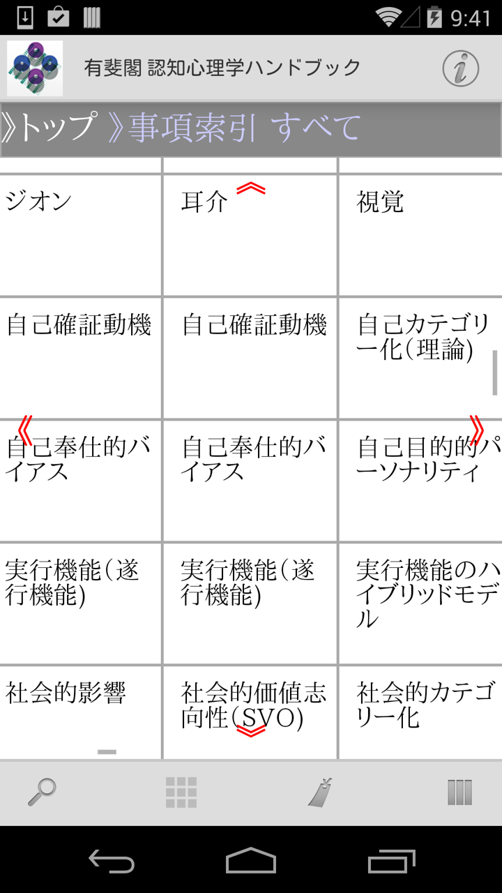 ・認知心理学について10の領域、173項目に分けた目次をサイドメニューとして表示、読み物として利用できます。