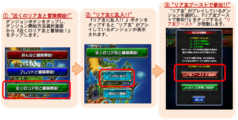 “リア友”がプレイしているダンジョンに乱入する際、『リア友ブーストで参加!!』を選択することで“リア友ブースト”が発動します!
