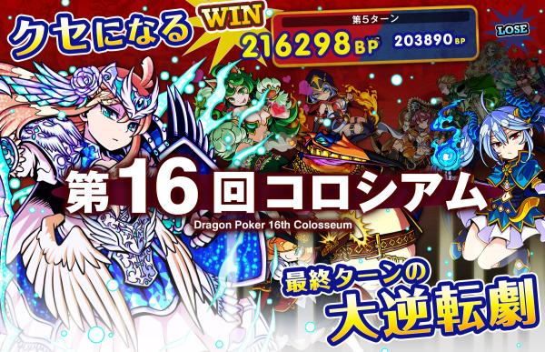 iPhone・Androidアプリ「ドラゴンポーカー」にて『コロシアム』の第16回大会が、2014年7月21日(月・祝)より開幕致します。プレイヤー同士が闘うチーム対抗戦『コロシアム』は、1人ひとりの一手がチームの勝敗を大きく左右する“究極の心理戦” ともいえます。リーグ昇格と、報酬の“ドラゴンメダル”大量獲得を目指し、7日間の壮絶なバトルに挑もう!