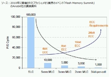 NANDフラッシュメモリの構造上、高密度化するほど、書き込み回数が減るため利用者の不安の元になっています。