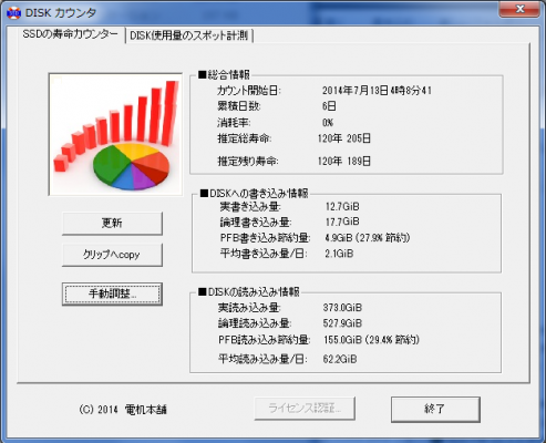 「SSD寿命カウンタ」は導入時よりSSDへの書き込みを記録し、実際にディスクに書き込んだデータ量を記録します。