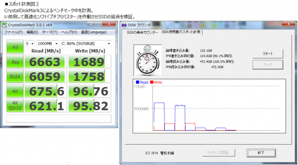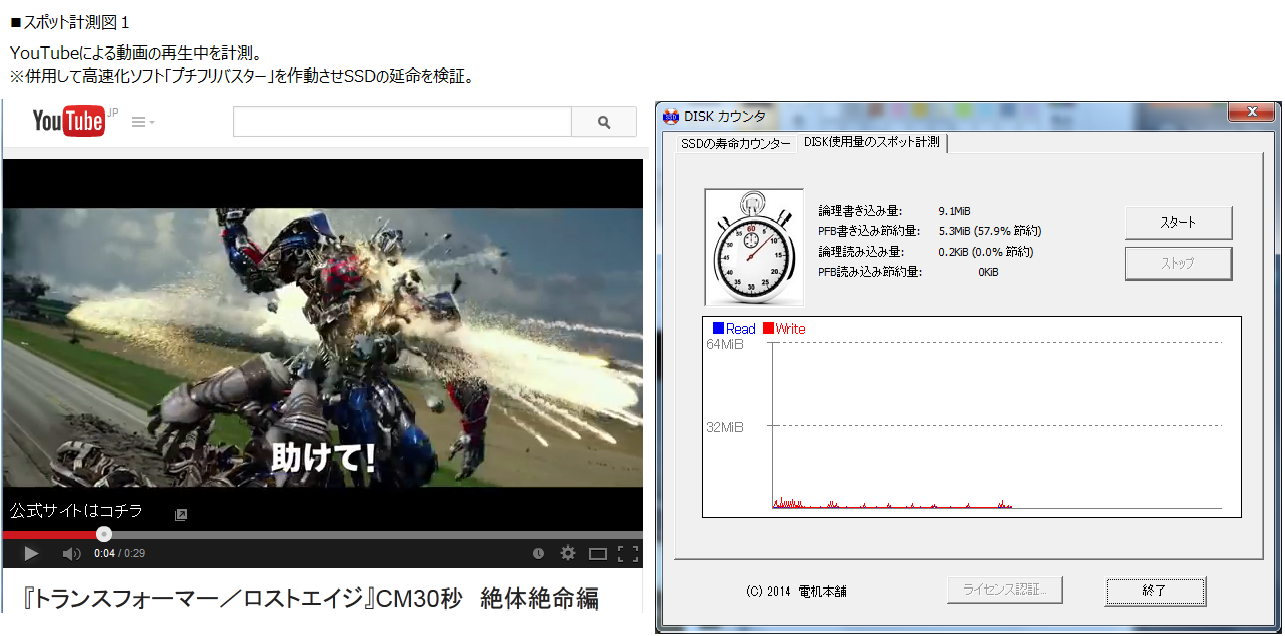 スポット計測図1において、YouTubeの動画再生を計測しています。この図において「SSD寿命カウンタ」は、姉妹品・快速SuperDrive「プチフリバスター Duo drive」がSSDの書き込みの50%の節約を観測しました。