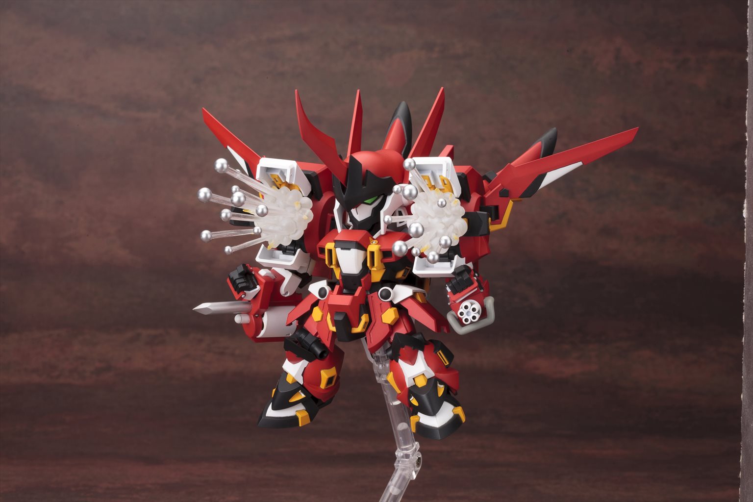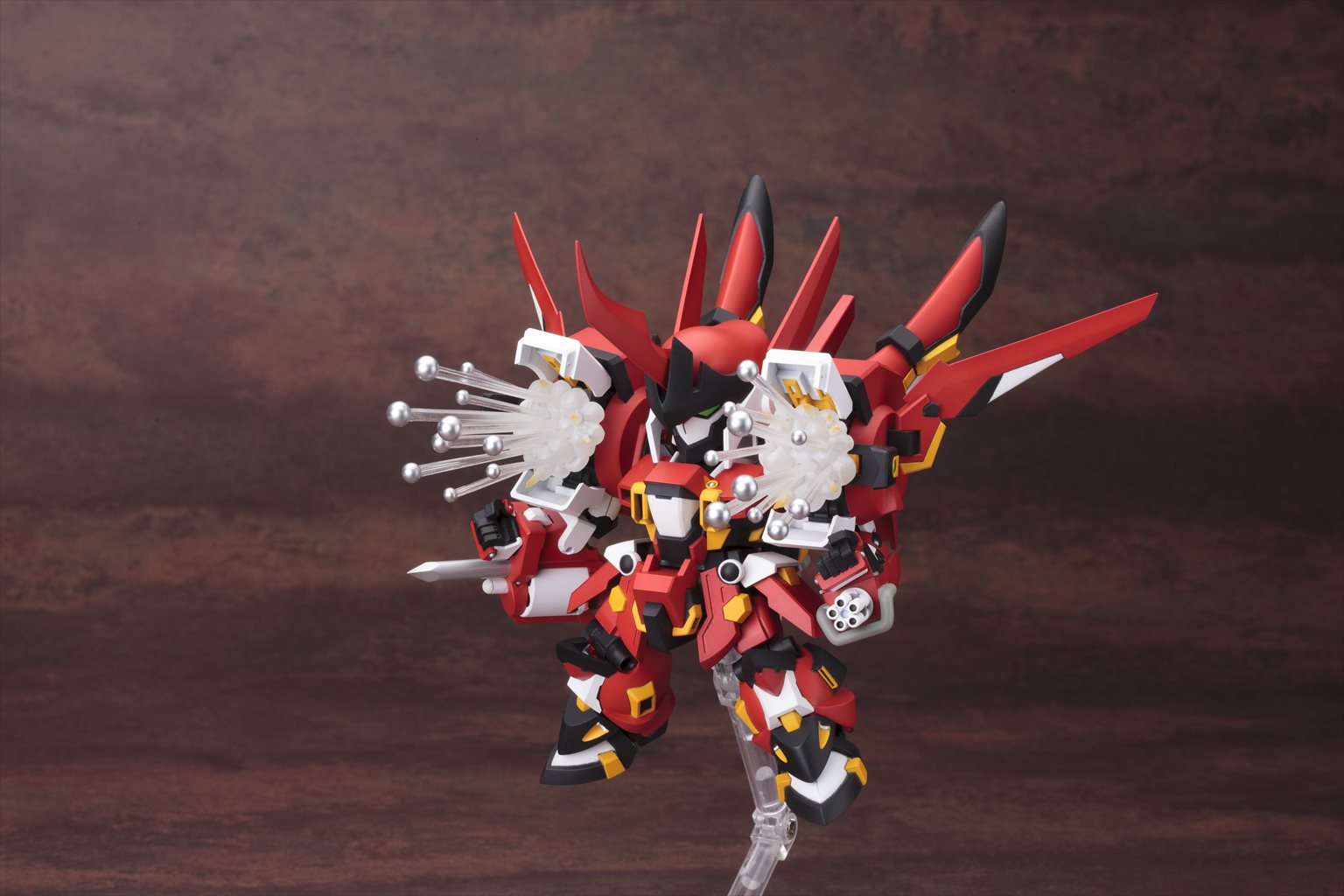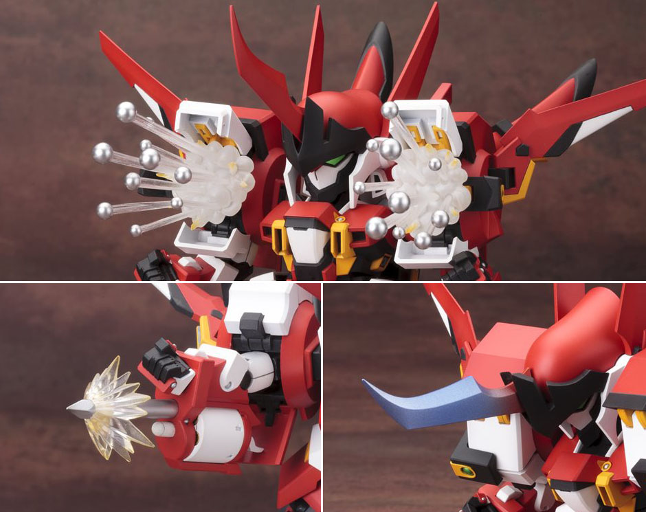 デフォルメながら、全身可動に拘り、肩部「アヴァランチ・クレイモア」の展開はもちろんのこと、腕部「リボルビング・バンカー」もプラモデルとしては初となるパーツ差し替え無しでの展開が可能となっており、劇中の様々なポージングの再現ができます。