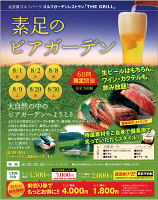 ゴルフ場の大自然を満喫しながら楽しむ『素足のビアガーデン』~ふかふかの芝生の上にテーブルを置いて、靴を脱いだらスタート。心地よい音楽にのせて、おいしいお酒とお料理の数々。夕方から夜にうつりゆく大自然の静かな時間を感じながら、ちょっと贅沢なひとときをお過ごしください。