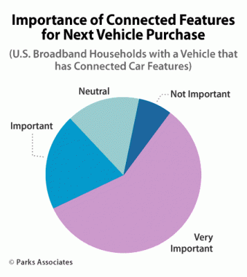 パークスアソシエイツ社が発表した新刊レポートによるとコネクテッドカーの機能は消費者へ急速に受け入れられている。米国においてコネクテッドカー機能を1つ以上搭載した車両の所有者のうちの75%以上がこれらのサービスが次回購入する車両に影響を持つと答えており、50%以上が新車を購入する際に接続サービスが“非常に重要だ”と答えているとも伝えている。