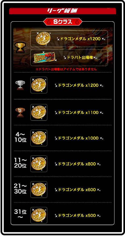 本リーグでの順位に応じて、「ドラゴンメダル」を報酬として贈呈いたします。順位によっては