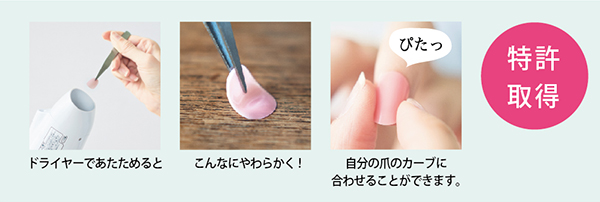一般的なネイルチップは、プラスチックなどで作られた土台の上にジェルアートを施していますが、硬いためカーブの調節が難しく、外れやすいことがありました。このプログラムでお届けする特許取得の「形状ぴったりネイルチップ」は、土台自体がジェル上の樹脂でできており、ドライヤーの熱でやわらかくなる性質があります。このため自爪のカーブに合わせた形に仕上げることができます。密着度が高いため外れにくく、見た目も本物のジェルネイルをしているような自然な美しさです。