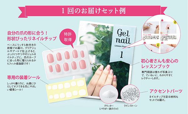 【セット内容】レッスンブック1冊、ネイルチップ1セット、装着シール(1シート・12枚)、アクセントパーツ(ラメ・ラインストーンなど)、クリアジェル(初回のみ)、チップスタンド(初回のみ)