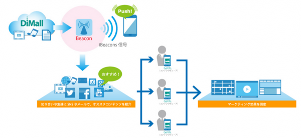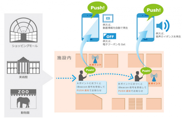 利用フローとしては、iBeaconと専用アプリ「Getits(ゲッツ)」(*3)が通信をし、特定エリアに入ったお客様への通知・配信・再生などが自動的に行えるのでストレスなくお客様に情報を配信することができます。