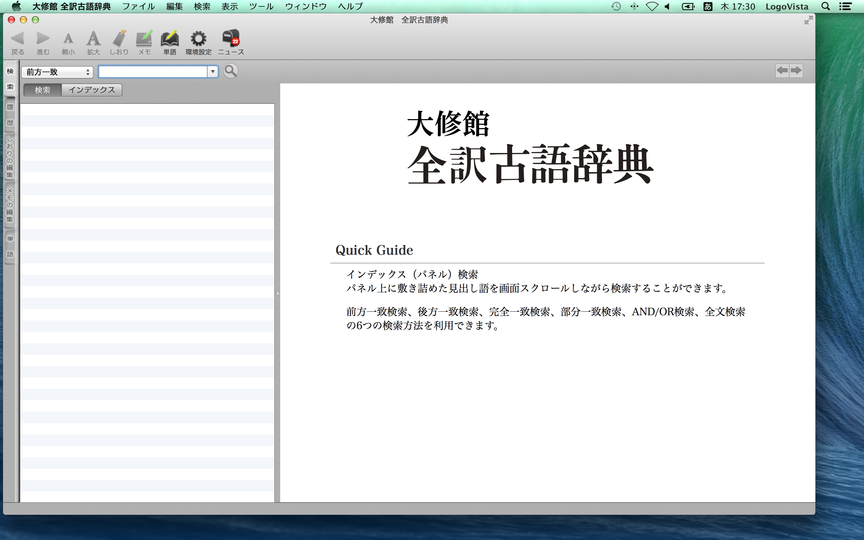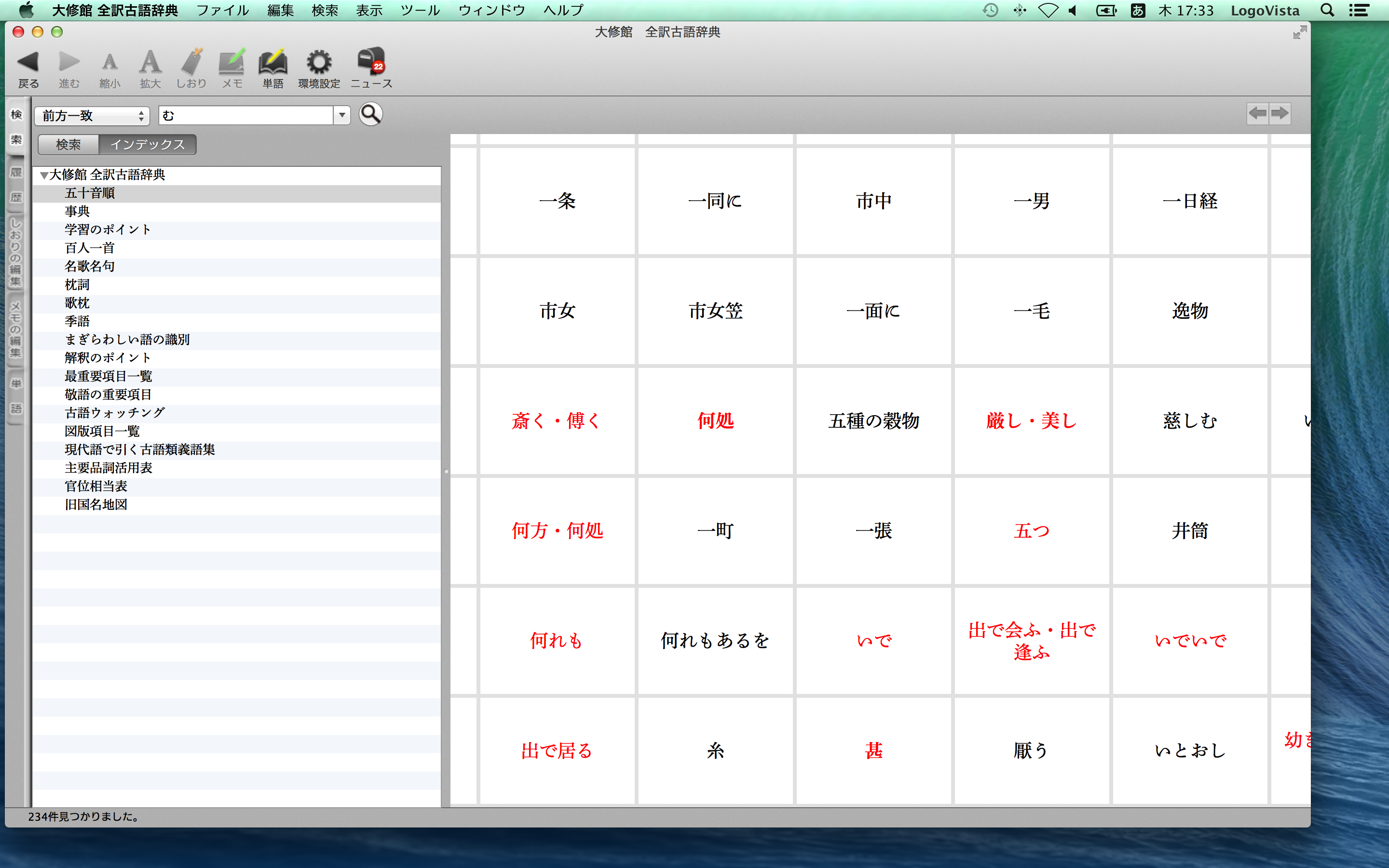 画面を最大限活用したインデックス検索を搭載。単語を記したパネルを所狭しと並べることで周囲の単語を見渡すこともでき、従来不足しがちとされてきた一覧性を補いました。特に、見出し語の「五十音」順だけでなく「事典」「学習のポイント(品詞別、敬語)」「枕詞」「季語」「解釈のポイント」「図版」・・・・・といった様々なパネルが準備されており、学習のみならず楽しめる辞典となっております。